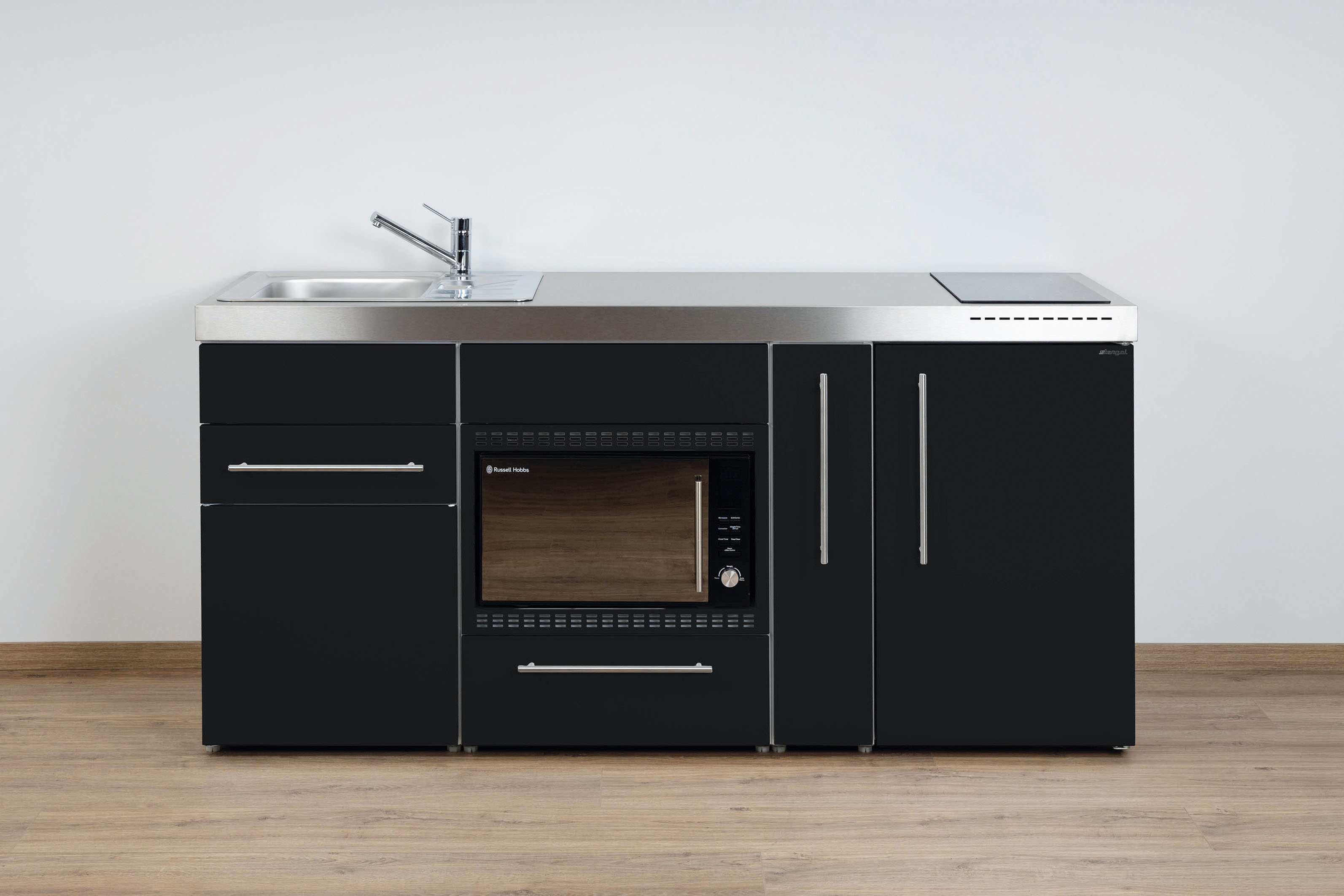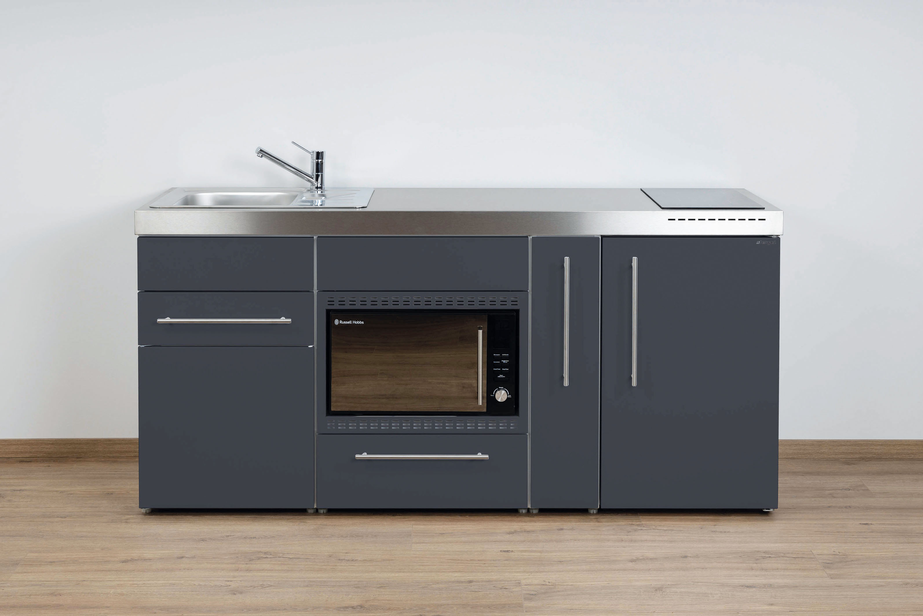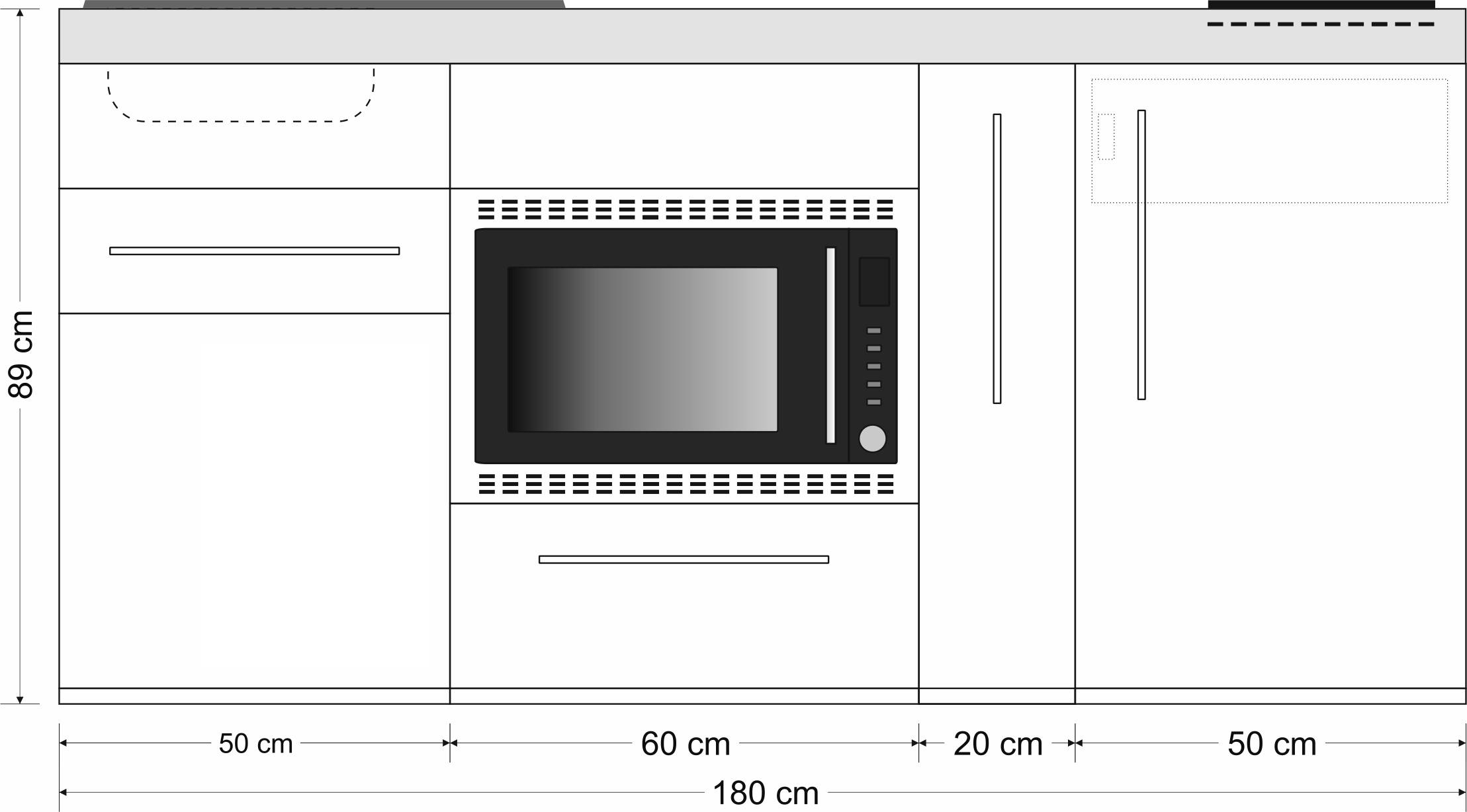 Miniküche Premiumline mit Kühlschrank, Mikrowelle/Grill, 2 Schubladen, Auszug, 180 cm breit
