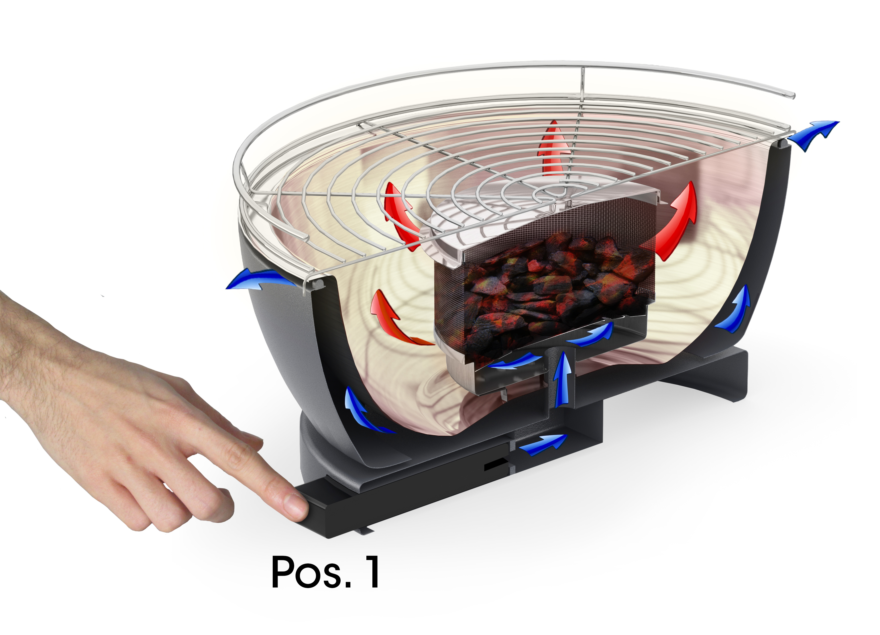 Herausnehmbarer und über USB-Kabel wieder aufladbarer Lüfter, für schnelles anzünden, regelbare Grilltemperatur und bis zu 4 St Grillzeit